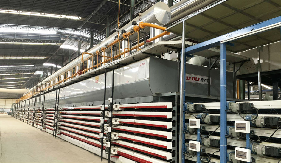 EM7 high-efficiency self-circulatingseven-layer dryer adopts 11 independent circulating mold sections, largeinternal cavity design, reasonable height, ingenious pipe design, scientificheat transport, and automatic program control.Equipped with uniquedouble-outlet heating wind and self-circulation structure independentlydeveloped by DLT, with good stability, less mechanical cracking and brick movingrule.