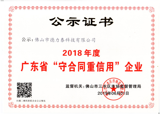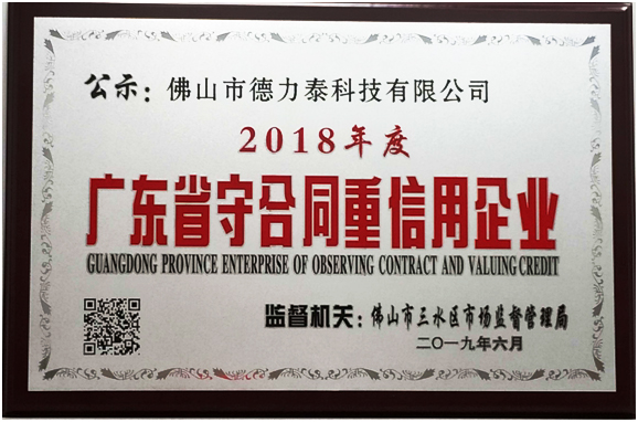 【喜訊】德力泰榮獲廣東省“守合同重信用”企業(yè)證書和牌匾