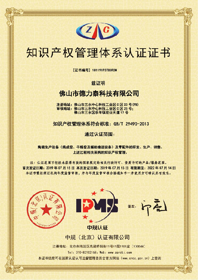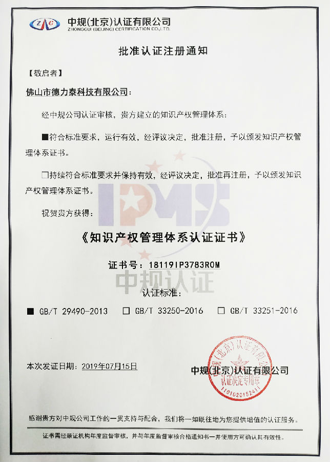 7月15日,佛山市德力泰科技有限公司獲得了由中規(guī)(北京)認(rèn)證有限公司頒發(fā)的《知識(shí)產(chǎn)權(quán)管理體系認(rèn)證證書》。