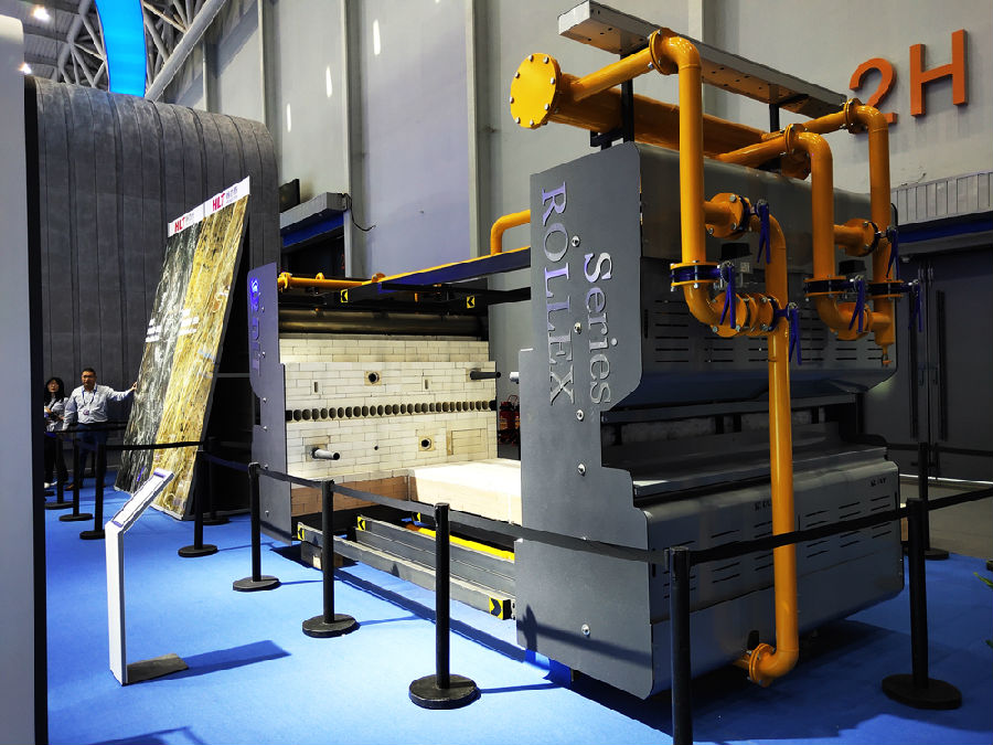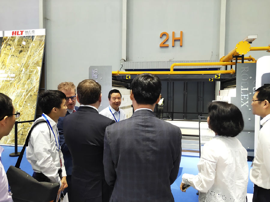 恒力泰展出的是最新研發(fā)的HT36000超大規(guī)格陶瓷板智能壓機1:1模型,是恒力泰自主研發(fā)設(shè)計生產(chǎn)的粉料壓制成型裝備。具有完全自主知識產(chǎn)權(quán),申請了30項專利,而且在某些領(lǐng)域頗具創(chuàng)新和領(lǐng)先優(yōu)勢,無疑是中國陶瓷裝備行業(yè)邁向智能制造新時代的重大突破。首塊1600*3600mm大板于6月19日在蒙娜麗莎集團一次性試產(chǎn)成功,打破了國外大噸位壓機全球市場的壟斷地位,充分說明了中國陶瓷裝備領(lǐng)域已經(jīng)具備了問鼎全球頂尖國際水平的技術(shù)實力。