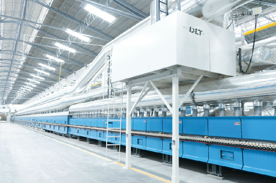 為打造成高品高質(zhì)、極具空間美學(xué)的巖板產(chǎn)品,新錦成集團(tuán)引進(jìn)了德力泰一條全新優(yōu)化設(shè)計(jì)的現(xiàn)代工業(yè)4.0數(shù)字化、智能化、電腦自動(dòng)操控的YEB系列高端巖板專用窯、一條高效節(jié)能自循環(huán)五層干燥器、配套釉線干燥及噴墨前后干燥等設(shè)備。主要生產(chǎn)規(guī)格有1600*3200(mm)、800*2600(mm)、1200*2600(mm),厚度6-18mm的健康巖板,設(shè)計(jì)最大產(chǎn)量達(dá)14000m2/天。
