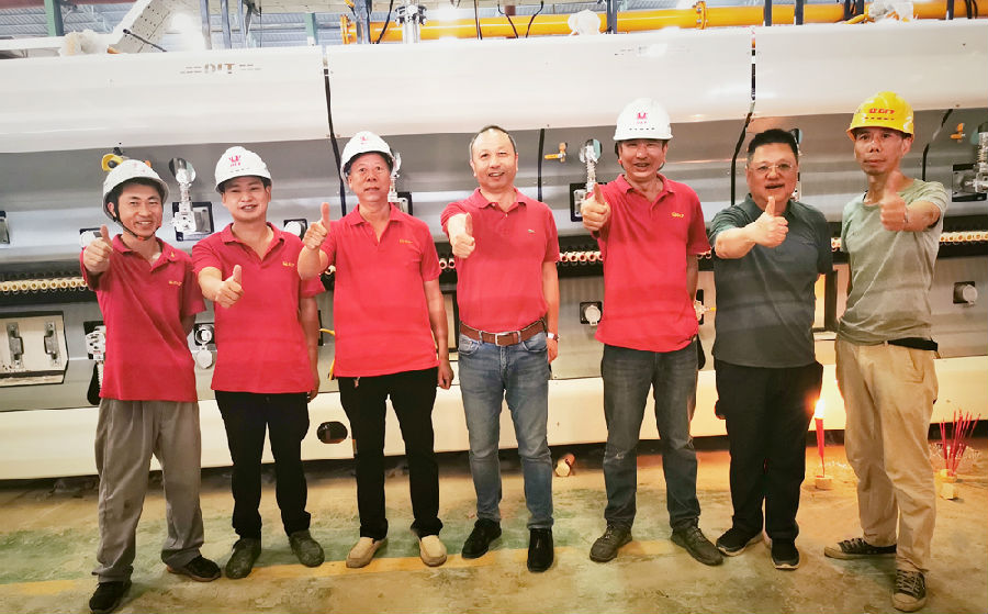 2020年9月8日上午,四川夾江縣盛世東方陶瓷有限公司(以下簡(jiǎn)稱“盛世東方”)5#生產(chǎn)線的項(xiàng)目現(xiàn)場(chǎng),一派喜慶景象,吉時(shí)8:18迎來了德力泰承建的工業(yè)4.0能效標(biāo)桿——西南地區(qū)首條3mm超韌健康纖薄巖板窯爐的點(diǎn)火儀式。