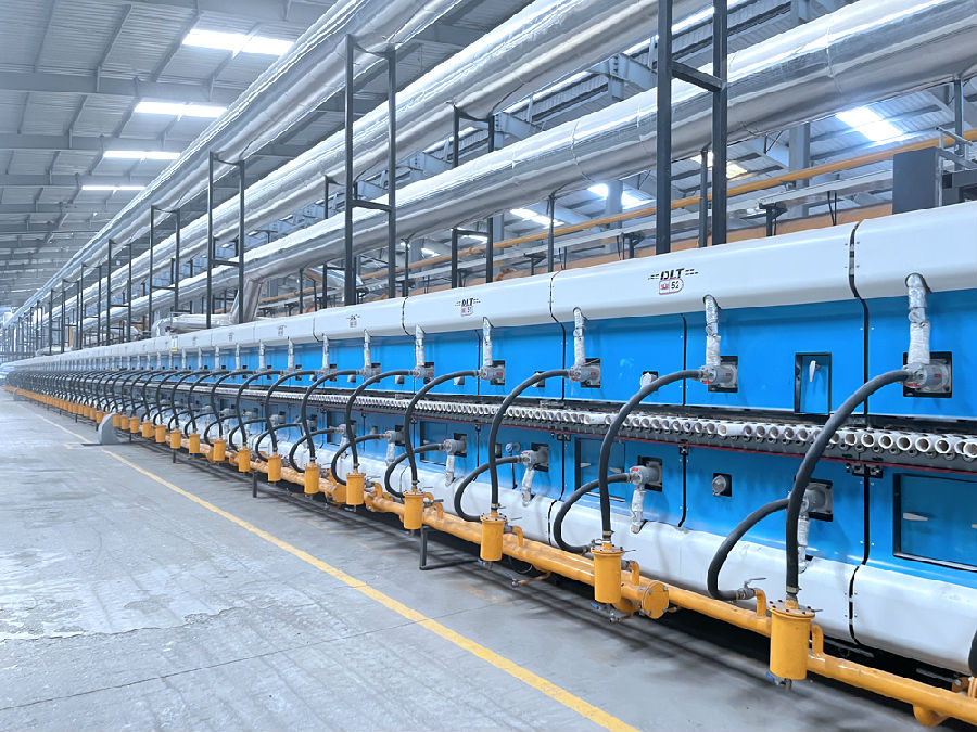 為契合當?shù)刈非髧H瓷磚的流行趨勢,TAKAO在高品質全拋釉地磚布局中的第五條生產線,再次采用力泰品牌整線裝備。該項目包括恒力泰科技四套60T節(jié)能間歇式球磨機、一套ConTinuB數(shù)字化連續(xù)球磨機60T *2及配套設備;恒力泰機械3臺自動液壓機YP5209;德力泰科技“4.0能效標桿數(shù)智時代”專業(yè)燒成窯(W3000/L277.2M)組合及釉線等成套輔機,并配置了德力泰DHR、KHI等多項專利技術。主要生產規(guī)格為800*800mm全拋釉磚,設計產量1.5萬m2/天。
