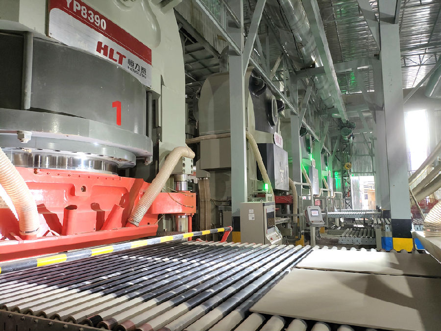 本次項(xiàng)目中引進(jìn)的力泰陶機(jī)裝備包括恒力泰科技PST28000型智能噴霧塔 ;恒力泰機(jī)械新一代機(jī)王LT6809自動(dòng)液壓機(jī)三臺(tái)、YP8390自動(dòng)液壓機(jī)一臺(tái);德力泰科技“4.0能效標(biāo)桿數(shù)智時(shí)代”大板高端燒成窯(W3100/L378M)和DHD-EM系列六層自循環(huán)干燥器組合??缮a(chǎn)規(guī)格為800×800mm、600×1200mm、750×1500mm、900×1800mm,厚度10mm的高品質(zhì)大板。投產(chǎn)至今優(yōu)等率一直保持在98%以上。